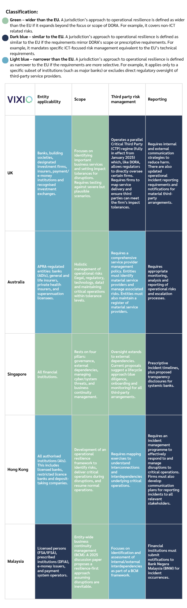 Following on from this, the two most widely known regimes for operational resilience are contained in the EU’s Regulation (EU) 2022/2554 (Digital Operational Resilience – DORA) and the UK’s operational resilience. These frameworks, broadly, mirror the Basel Committee’s Principles, but extend the scope to include a wide range of financial entities. However, several other jurisdictions have likewise devised their own operational resilience framework.